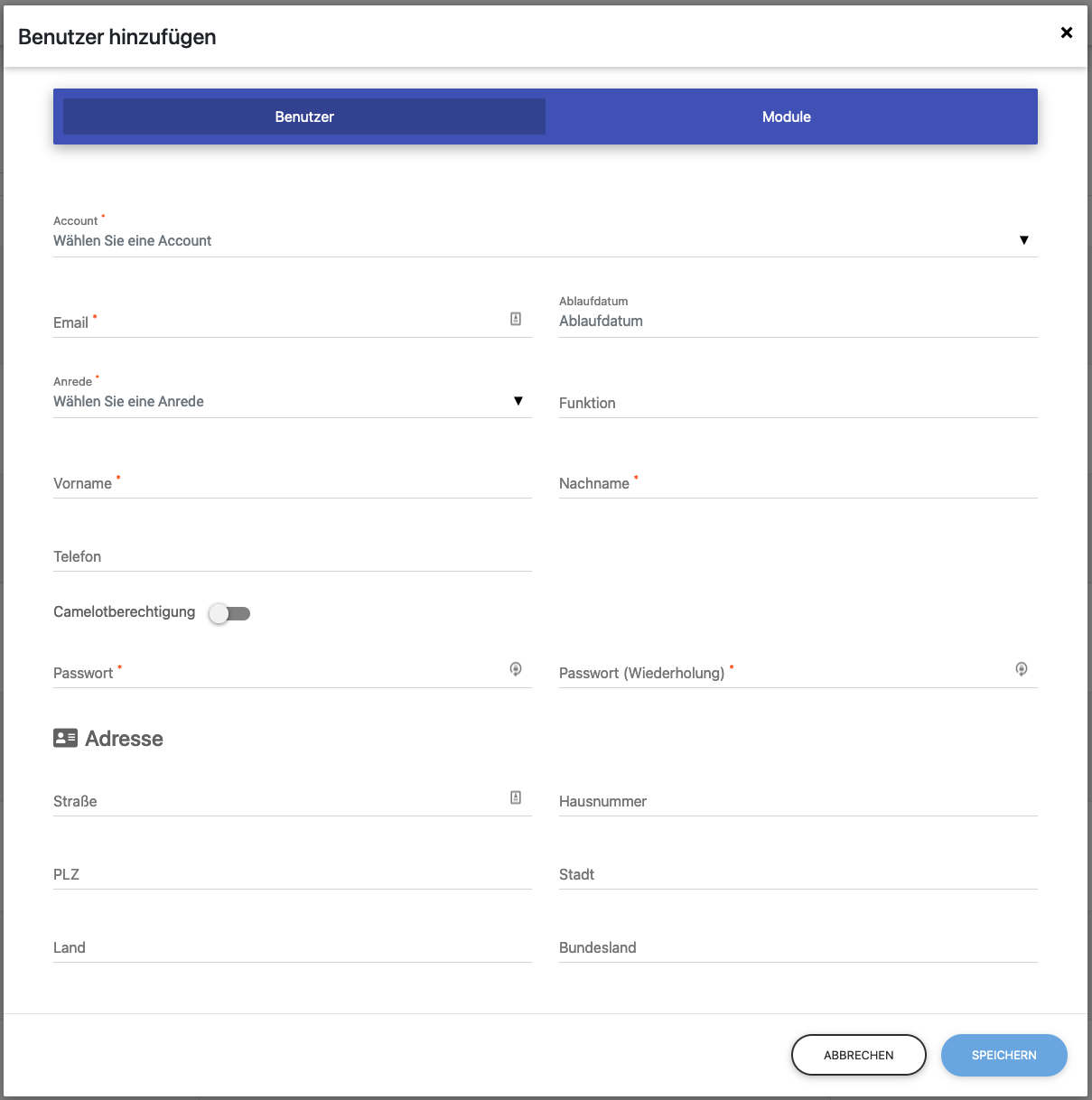 Hier können Sie die Details eines Nutzers festlegen. Auf dem Reiter Module können danach die Zugriffsrechte für diesen Nutzer eingestellt werden.