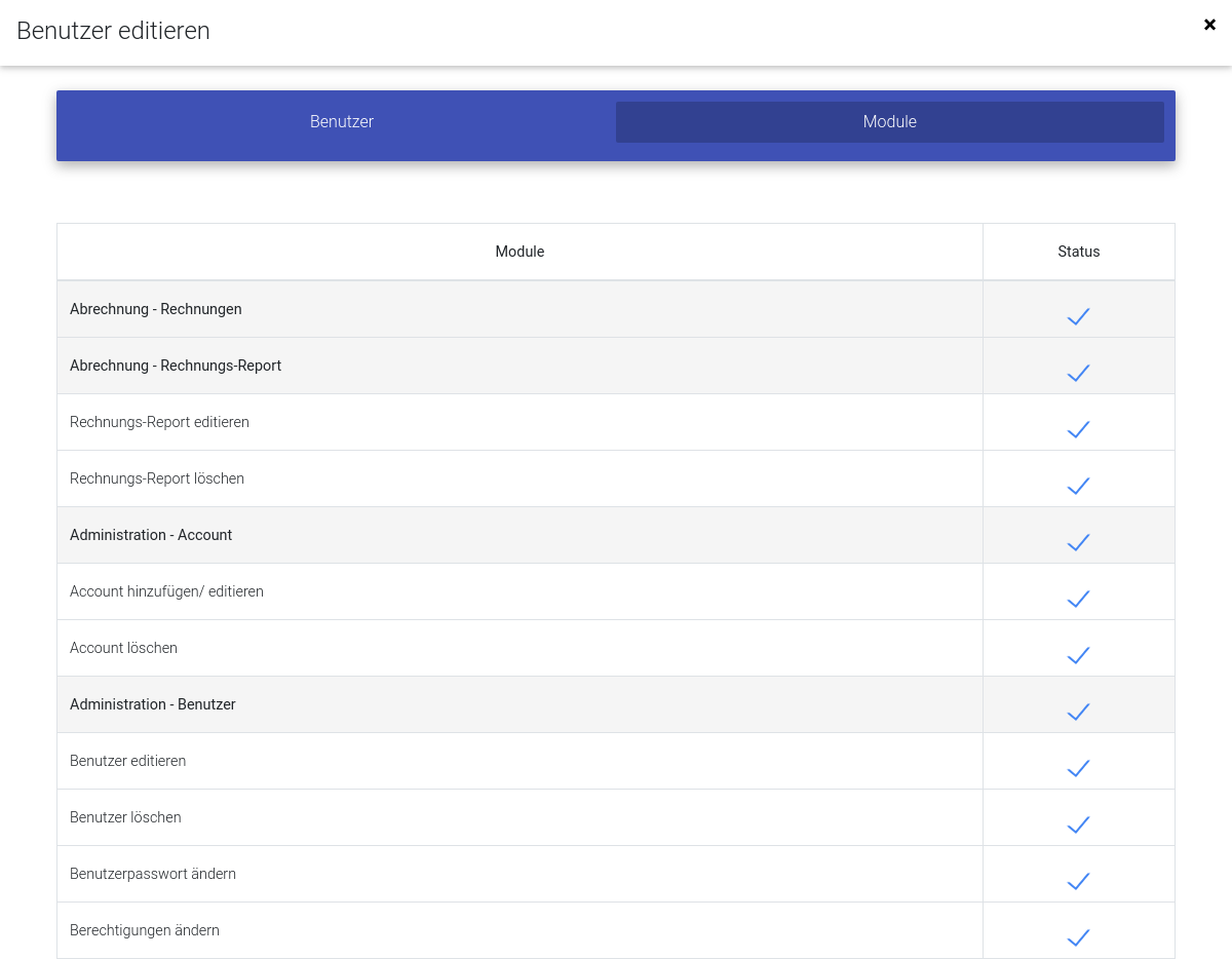Über den Bearbeiten-Button neben jedem Nutzer können die Details (E-Mail, Name, Adresse, Telefonnummer, Funktion) eines Nutzers eingesehen und bearbeitet werden. Ausserdem können Sie Zugriffsberechtigungen für Module anpassen.