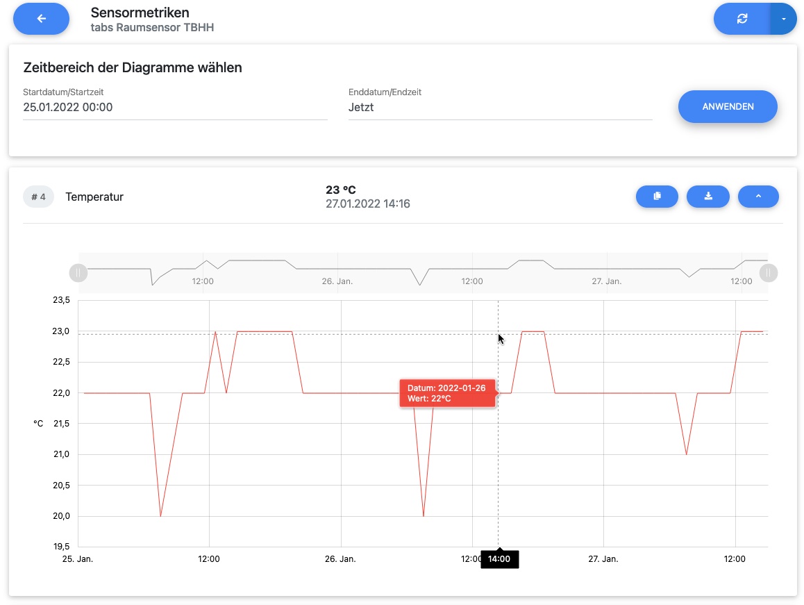 Über das Diagramm-Icon gelangen Sie zur Visualisierung der hinterlegten Metriken eines Sensors. Dies ist nur möglich, wenn dem jeweiligen Sensortyp auch passende Metriken zugeteilt sind. Die Ansichten der Visualisierung können zeitlich im Zeitbereichsabschnitt durch Auswahl des Datums und der Uhrzeit angepasst werden. Sie können rechts oben die Metriken mit dem Reload-Icon aktualisieren.
