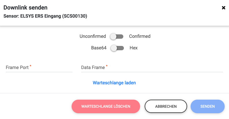 Falls sich bereits Downlinks in der Warteschlange befinden, können diese mit Warteschlange laden angezeigt werden. Möchten Sie bestehende Downlinks aus dieser Liste entfernen, kann dies über Warteschlange löschen erfolgen.