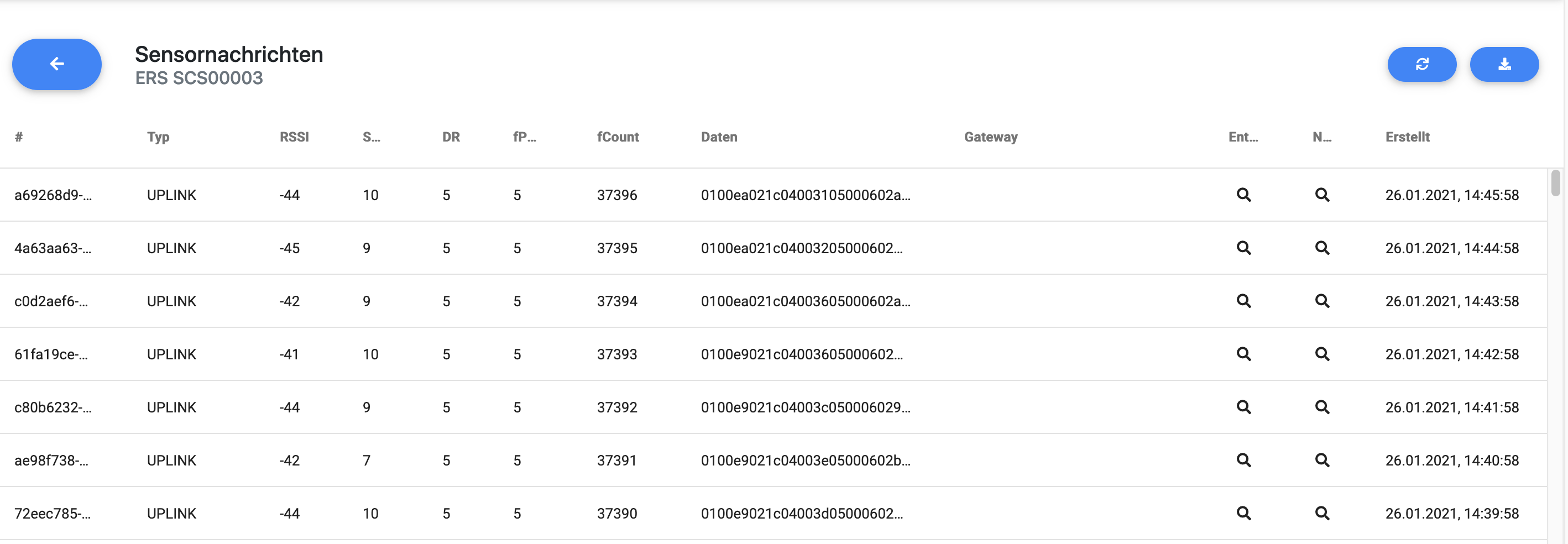 Über das Brief-Icon werden alle Nachrichten des jeweiligen Sensors aufgelistet - sortiert nach der aktuellsten Nachricht. Zum Aktualisieren der Tabelle können Sie das Reload-Icon verwenden.