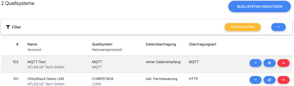 Die Anbindung von externen Quellsystemen ist ein zentraler Bestandteil von ATLAS I/OS. Sie ermöglicht die automatisierte Erfassung und Verarbeitung von Sensordaten aus verschiedenen Quellen – etwa über MQTT-Broker oder direkt von LoRa Network Servern (LNS). In diesem Abschnitt zeigen wir, wie Sie Quellsysteme anlegen, konfigurieren und verwalten können, um Ihre Datenströme effizient zu integrieren.