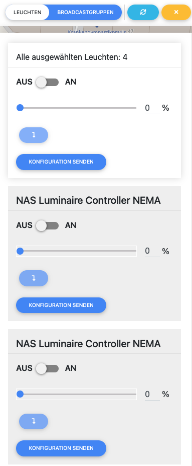 Hier können Sie die Leuchte an- oder ausschalten und deren Helligkeit regulieren. Es ist auch möglich, mehrere Leuchten auszuwählen, um diese zeitgleich zu steuern.